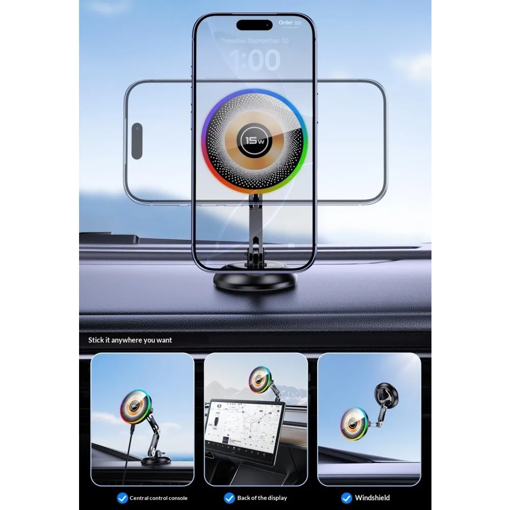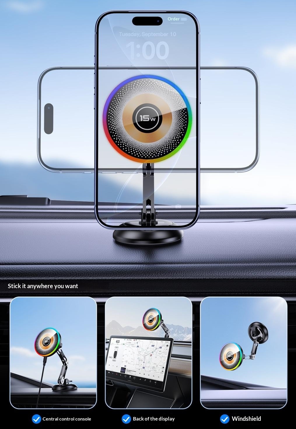 Držiak je určený na montáž na palubnú dosku alebo čelné sklo, kde poskytuje stabilné a pevné uchytenie aj počas jazdy. Nastaviteľná konštrukcia umožňuje ideálny uhol sledovania pre navigáciu alebo hands-free hovory. Magnetická hlava zabezpečuje rýchle prichytenie telefónu a pohodlné ovládanie jednou rukou.