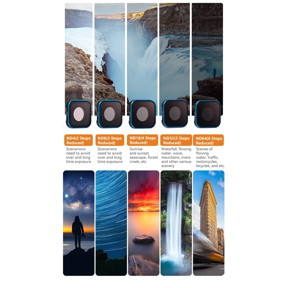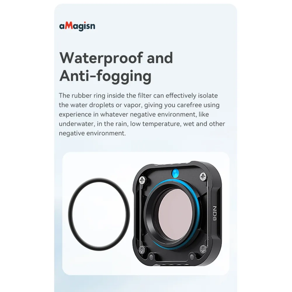 AMAGISN vodotesná sada ND filtrov pre GoPro Hero 13 12 11 11 Mini 10 9 ND4 ND8 ND16 ND32 je profesionálne príslušenstvo určené na natáčanie v jasných a náročných svetelných podmienkach. Filtre sú presne navrhnuté pre kompatibilné modely kamier a zachovávajú ich plnú funkčnosť aj vodoodolnosť. Vďaka kvalitnému optickému sklu zostáva obraz ostrý, farebne vyvážený a bez nežiaducich prepálení.