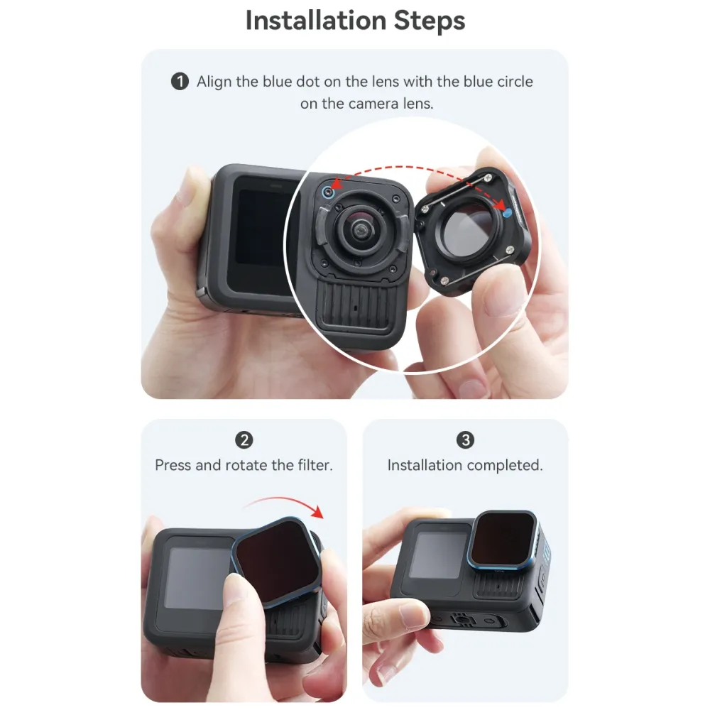 Typ produktu: ND filter pre akčnú kameru Materiál skla: optické sklo Materiál rámu: hliníková zliatina Konštrukcia: vodotesná s integrovaným tesnením Inštalácia: nasadzovací systém na objektív Určenie: natáčanie videa a fotografovanie v jasnom prostredí