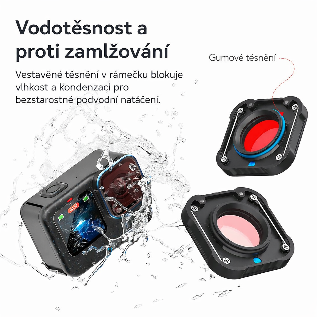 Filter je vyrobený z kombinácie kovu a akrylu, čo zaručuje nízku hmotnosť a zároveň vysokú odolnosť. Integrovaný gumový tesniaci krúžok pomáha zabezpečiť vodotesnosť a obmedzuje vznik zahmlievania pri zmenách teploty. Vďaka kompaktným rozmerom výrazne nezvyšuje veľkosť kamery a umožňuje pohodlné použitie pri potápaní, šnorchlovaní aj ďalších vodných aktivitách.