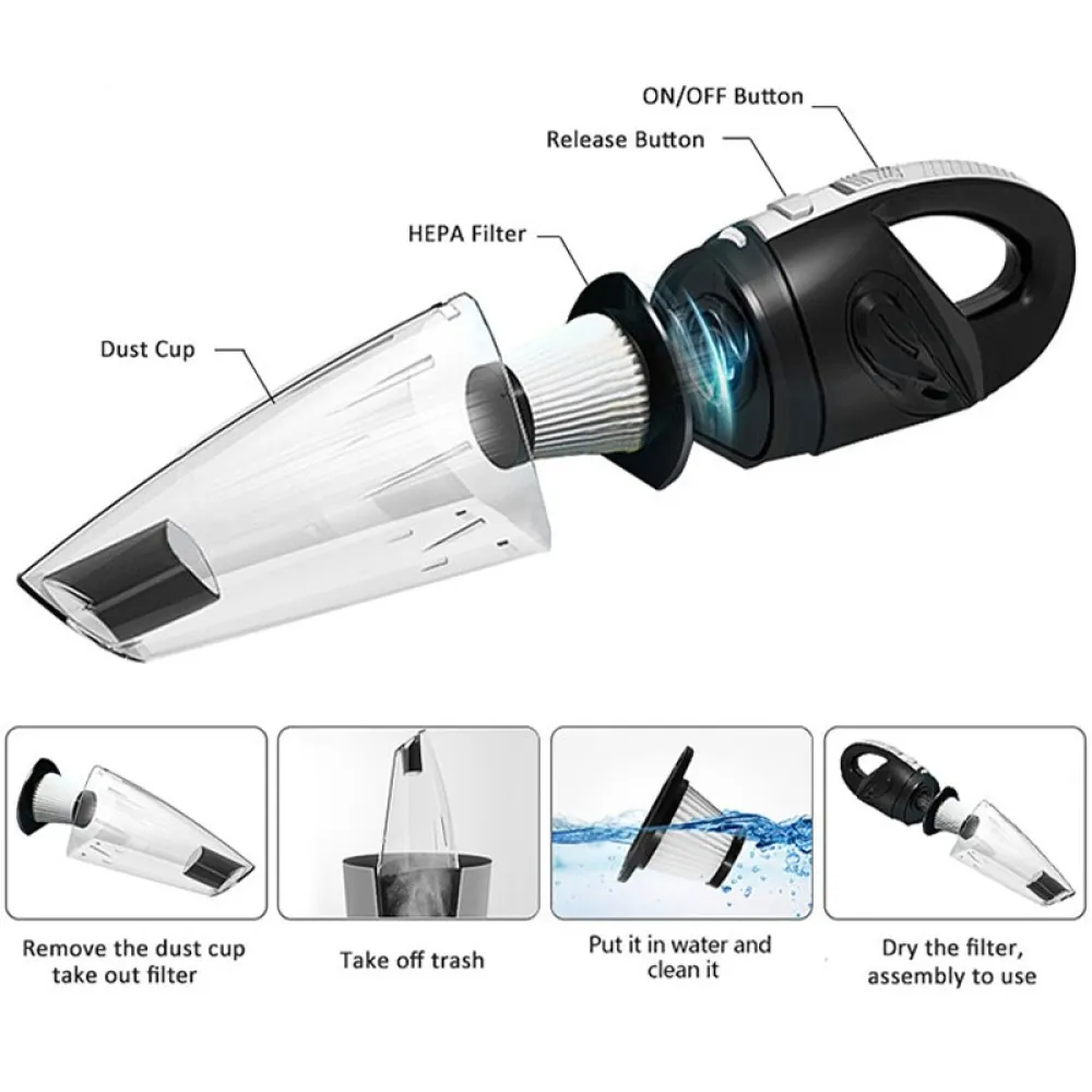 Bezdrôtový ručný vysávač do auta 120W na suché aj mokré vysávanie je praktický pomocník na rýchle upratovanie interiéru vozidla aj domácnosti. Vďaka kompaktným rozmerom a bezdrôtovému prevedeniu umožňuje pohodlné používanie bez obmedzenia káblom.