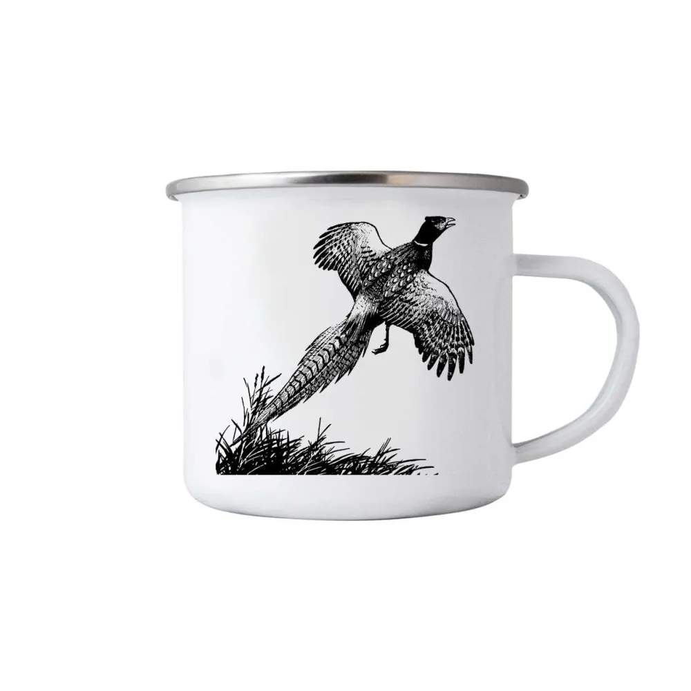 A bögrén egy repülő fácán látható, abban a pillanatban, amikor felszáll a fű közül a szabad ég felé. A finom vonalvezetés természetes hatást kelt, kiemeli a szárnyak formáját és a mozdulat eleganciáját. Az egész motívum élettel teli, felidézi a természet nyugalmát és megszólít mindenkit, aki szereti az erdőt, az állatokat és a hagyományos vadászati hangulatot.