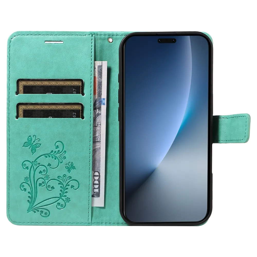 • Modrozelená farba a zaujímavý vzor motýľov podčiarkujú elegantný dizajn puzdra.