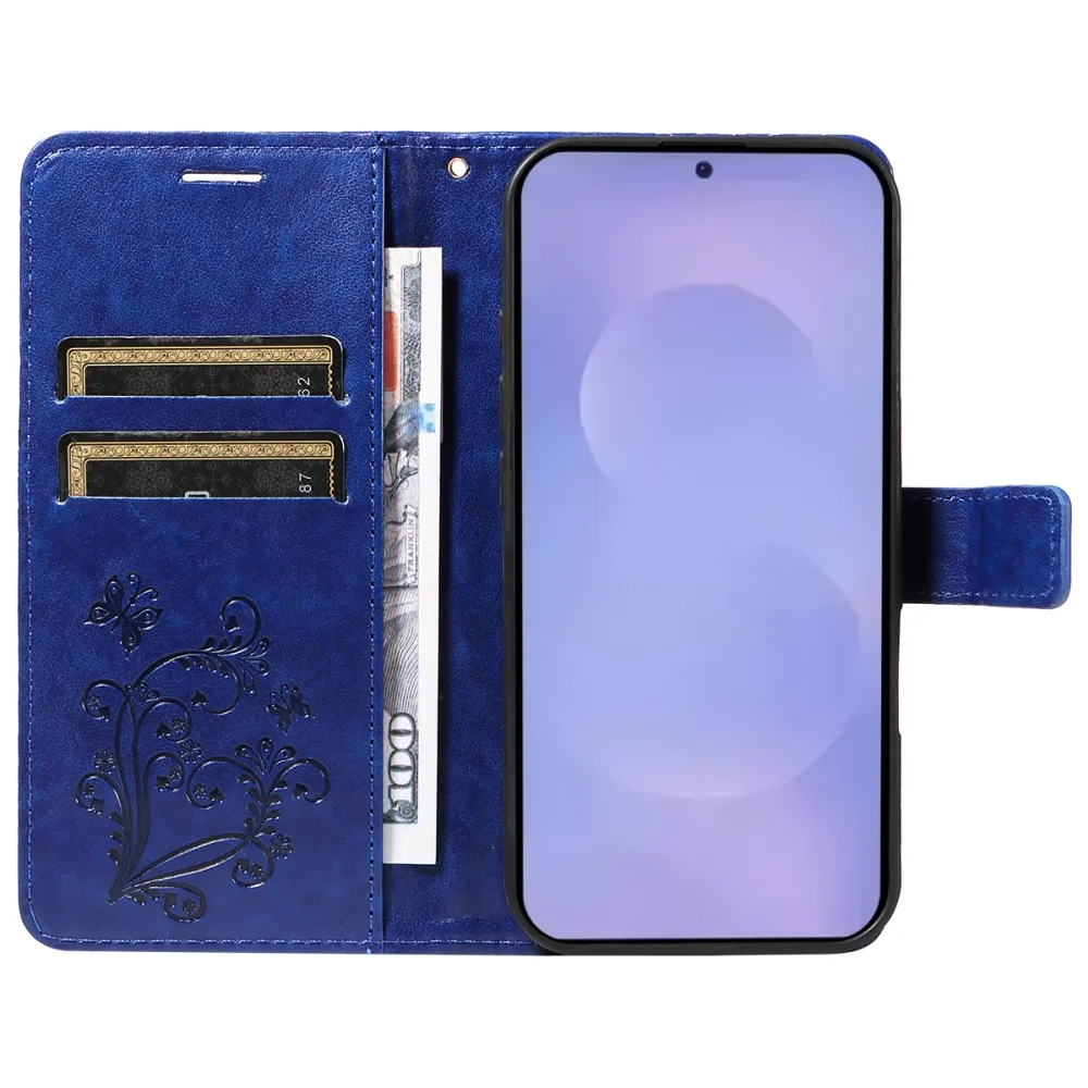 Modré peňaženkové púzdro Big Butterfly na mobil Samsung Galaxy S26+