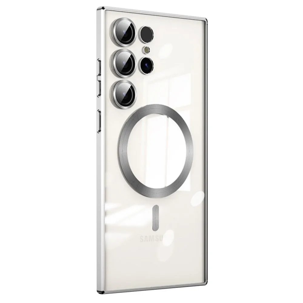 Clear obal s ochranou fotoaparátu a podporou MagSafe na Samsung Galaxy S23 Ultra - strieborný