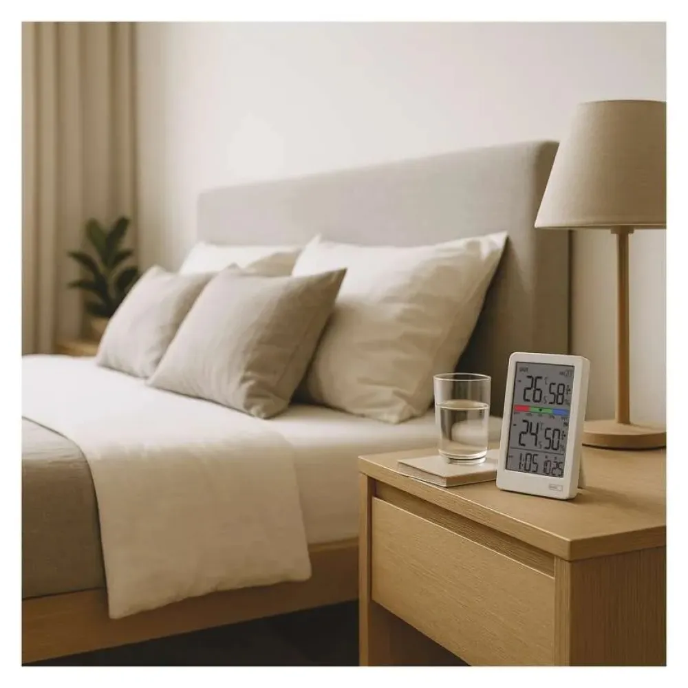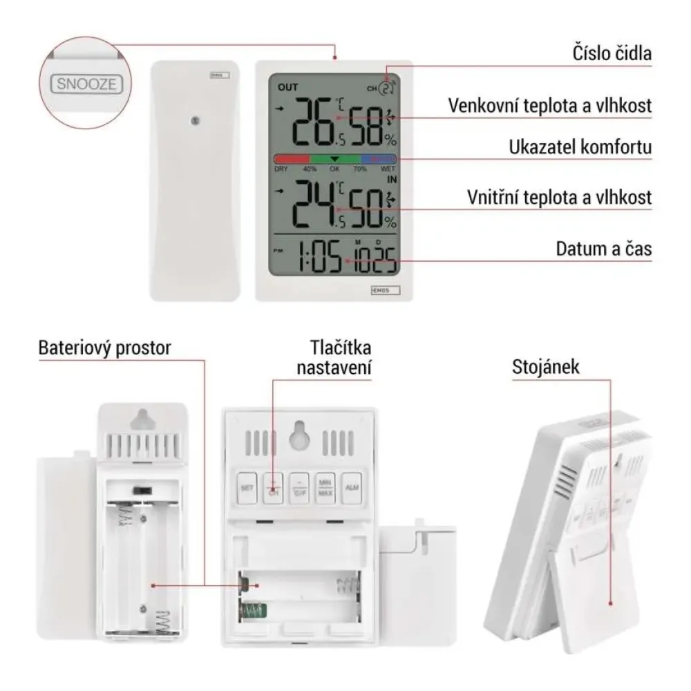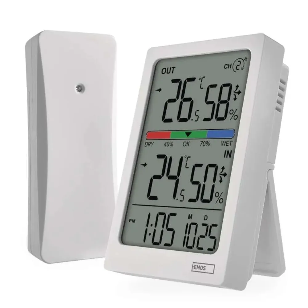 Moderný bezdrôtový teplomer vám jednoducho ukáže, aká je teplota vnútri aj vonku s rozlíšením 0,1 °C, zobrazí vnútornú aj vonkajšiu vlhkosť v rozsahu 1 % až 99 % RV a ponúkne aj zobrazenie trendu teploty alebo trojúrovňový ukazovateľ komfortu. S meraním vonkajšej teploty vám pomôže bezdrôtový senzor, ktorý možno umiestniť až 100 m od teplomera vo voľnom priestore.