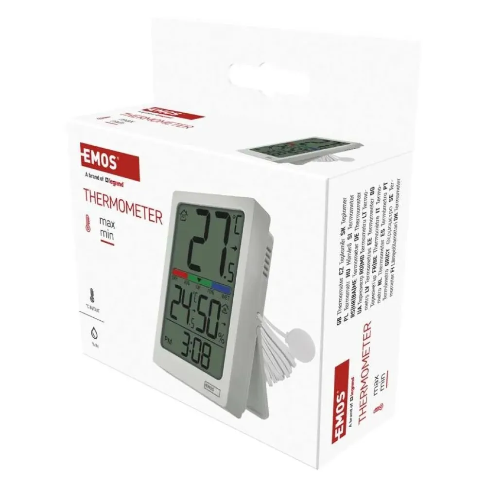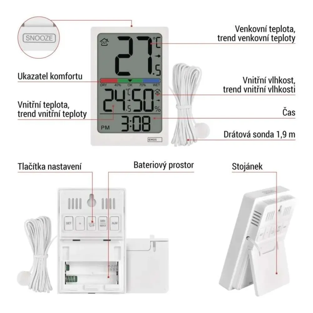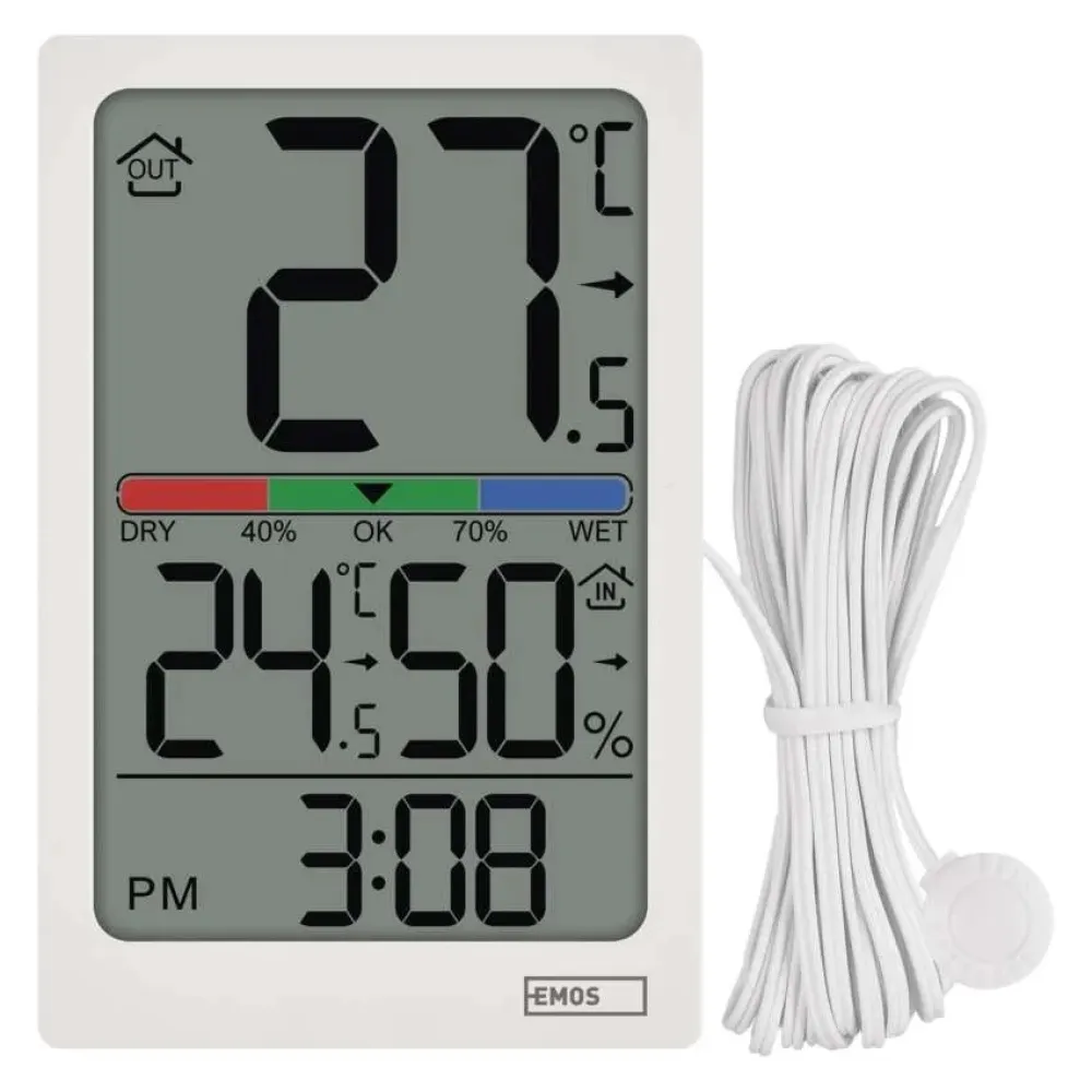 Novinka v rade drôtových teplomerov vám jednoducho ukáže aká je teplota vo vnútri aj vonku s rozlíšením 0,1 °C, zobrazí vnútornú vlhkosť v rozsahu 1 % až 99 % RV, ale aj trend teploty alebo ukazovateľ komfortu v troch úrovniach. S meraním vonkajšej teploty vám pomôže 1,9 m dlhé drôtové čidlo, ktoré umiestnite za okno a teplomer postavíte k oknu alebo zavesíte na stenu v dosahovej vzdialenosti od vonkajšieho čidla.