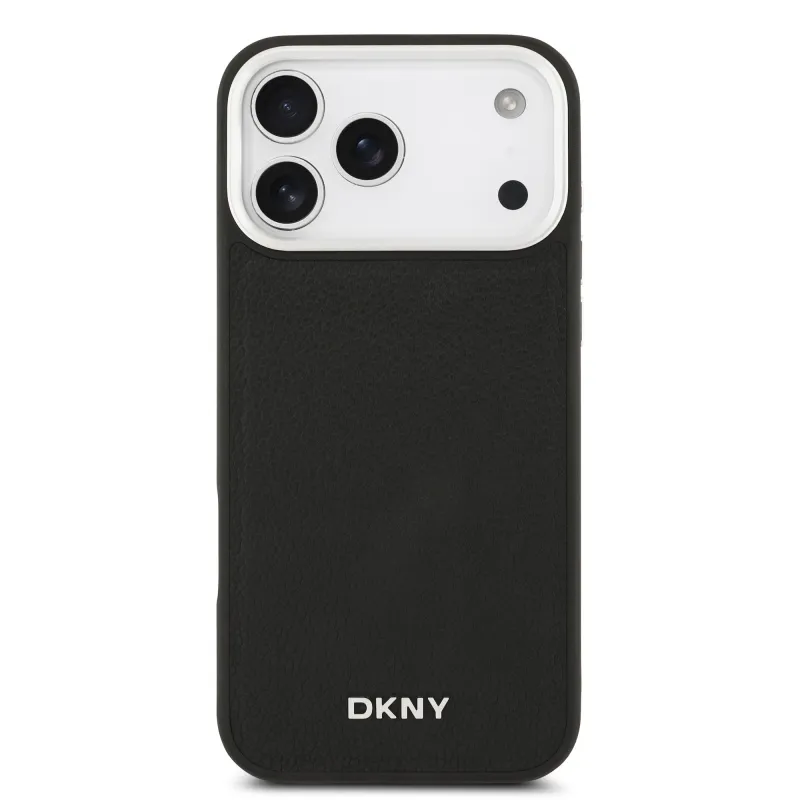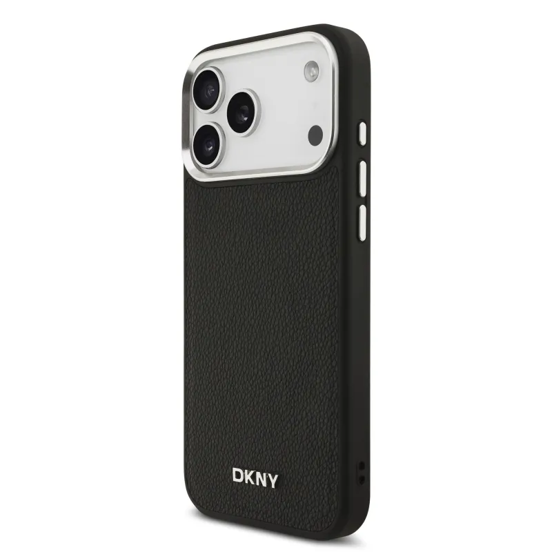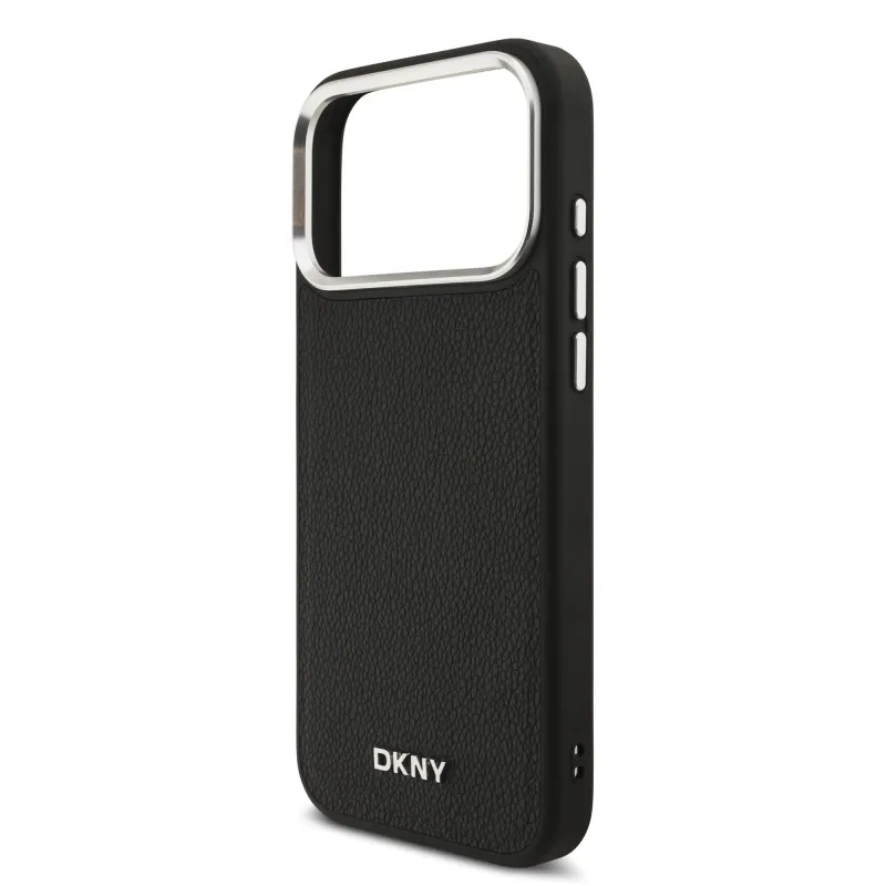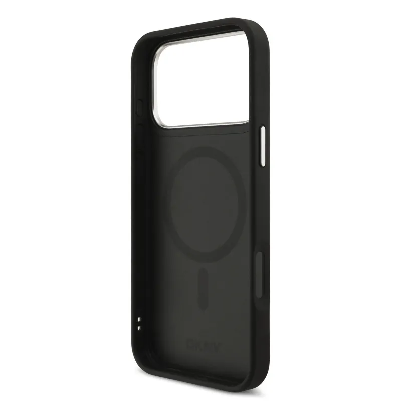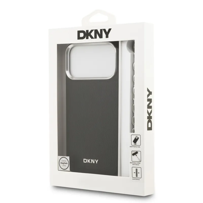 DKNY PU kožený kovový kryt s logom na zápästie MagSafe Back Cover pre iPhone 17 Pro Max Black
