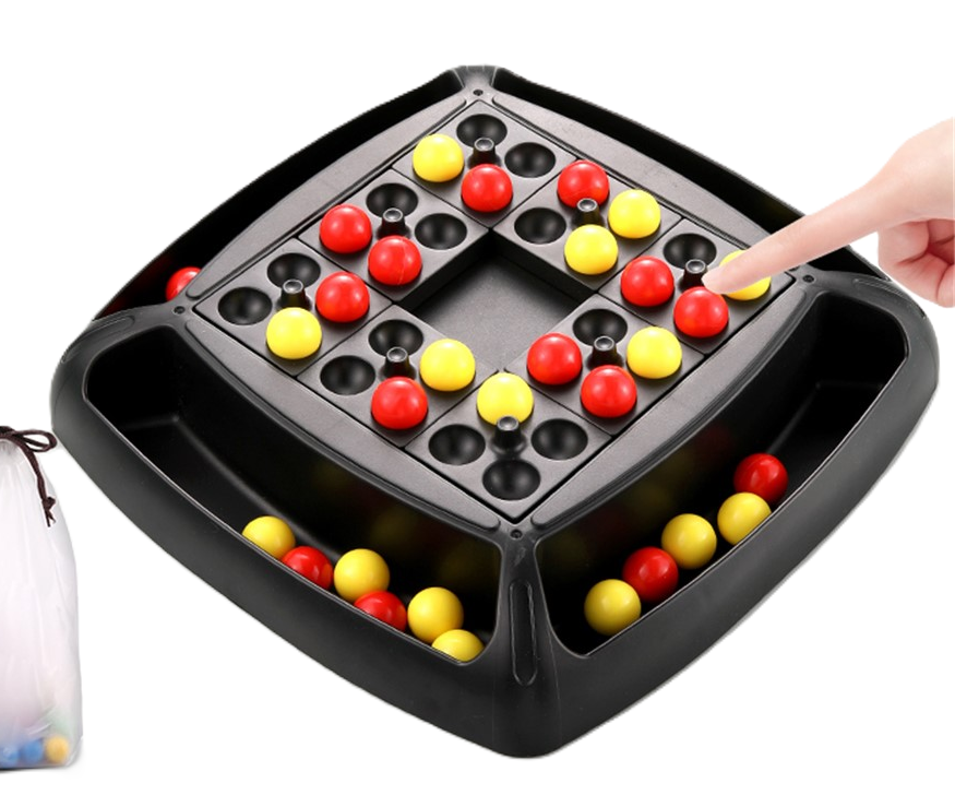 Táto dvojfarebná logická hra s guličkami je založená na jednoduchom princípe kombinovania dvoch farieb, ktorý deti prirodzene vedie k premýšľaniu a hľadaniu správneho riešenia. Kontrast červených a žltých guličiek pomáha jednoducho rozlišovať herné prvky a zároveň podporuje schopnosť plánovať ďalšie ťahy.