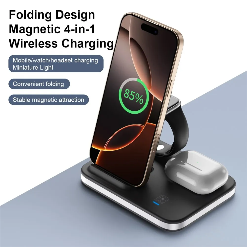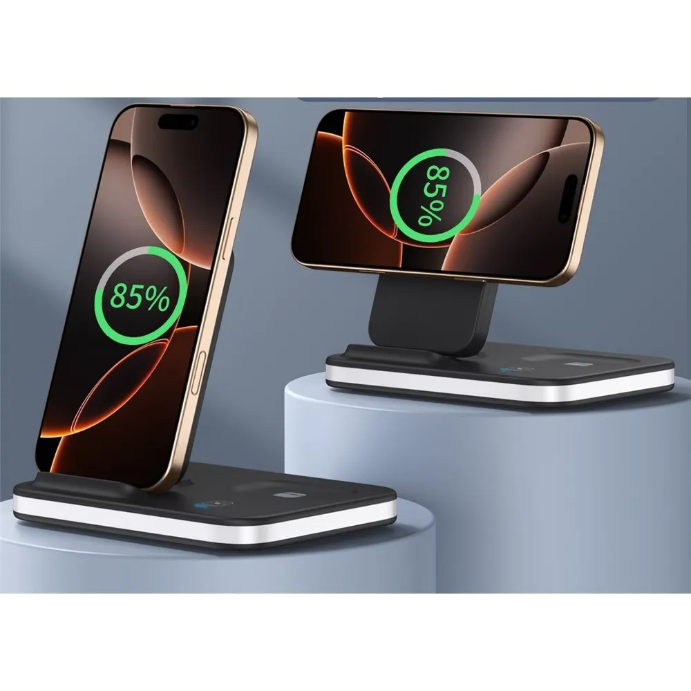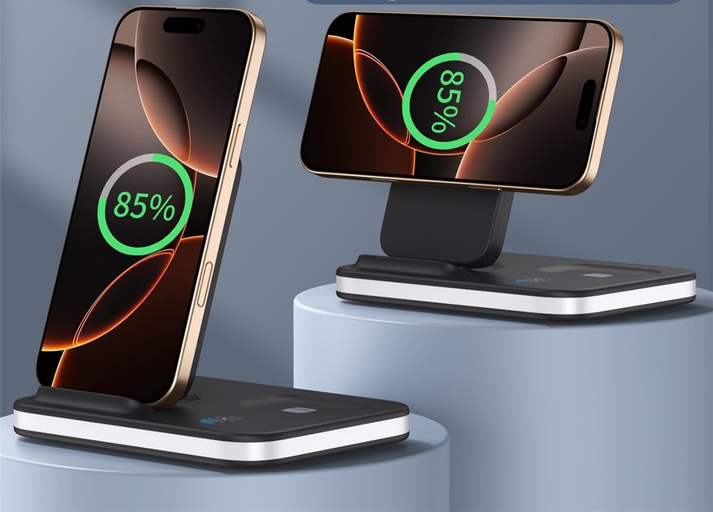 E16 multifunkčná skladacia bezdrôtová nabíjacia stanica s nočným svetlom je praktické riešenie na nabíjanie viacerých zariadení na jednom mieste. Umožňuje súčasné nabíjanie mobilného telefónu, bezdrôtových slúchadiel a Apple Watch, čím šetrí miesto a zjednodušuje každodenné používanie.