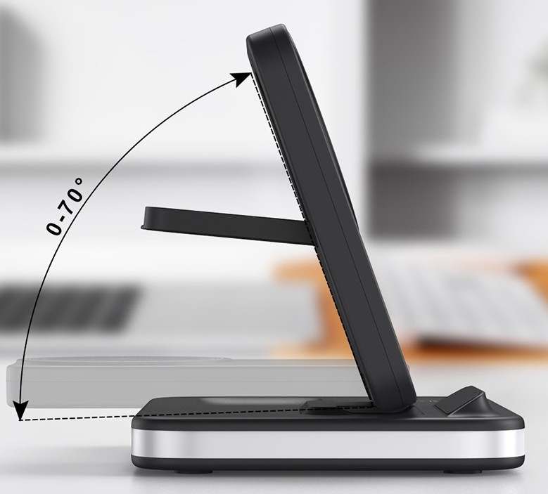 Skladacia konštrukcia umožňuje jednoduché prenášanie aj nastavenie ideálneho uhla na sledovanie displeja počas nabíjania. Nabíjačka je vyrobená z odolného ABS plastu a ponúka stabilnú prevádzku s účinnosťou nabíjania ≥73 %.