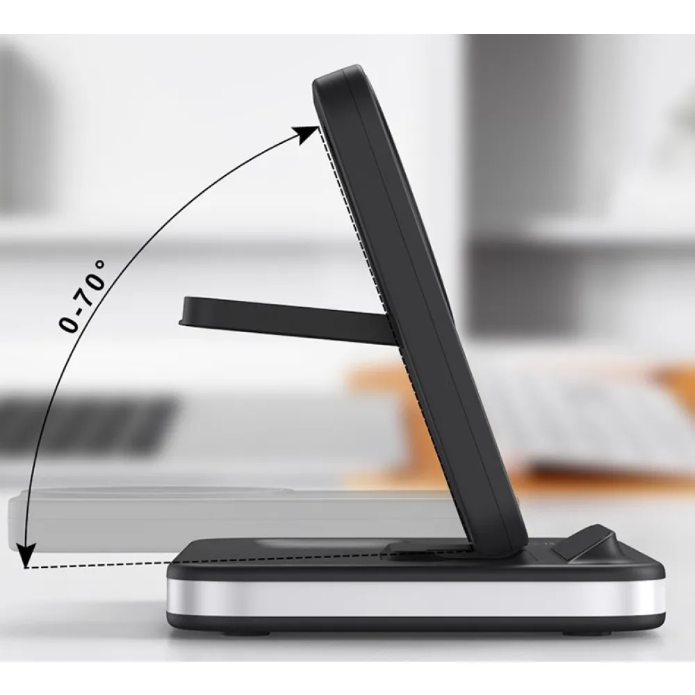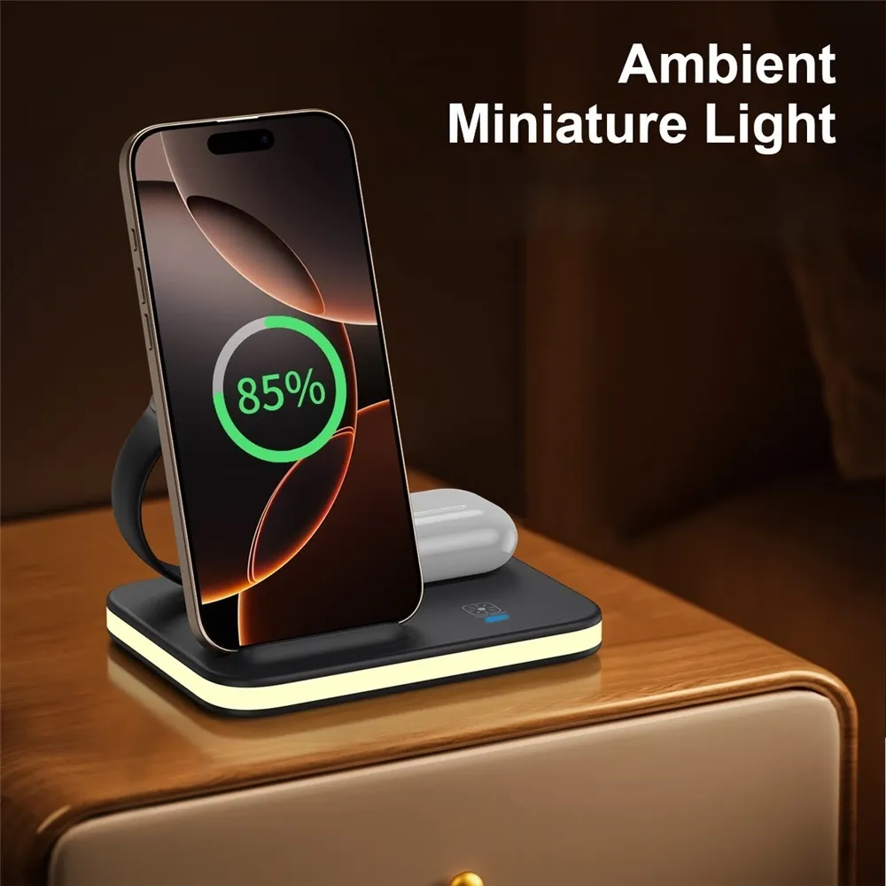 Vďaka podpore QI bezdrôtového nabíjania dosahuje výkon až 15 W pre telefón, zatiaľ čo slúchadlá a hodinky sa nabíjajú optimalizovaným výkonom pre bezpečné a efektívne doplnenie energie. Integrované nočné svetlo pridáva praktickú funkciu na použitie na nočnom stolíku alebo pracovnom mieste.