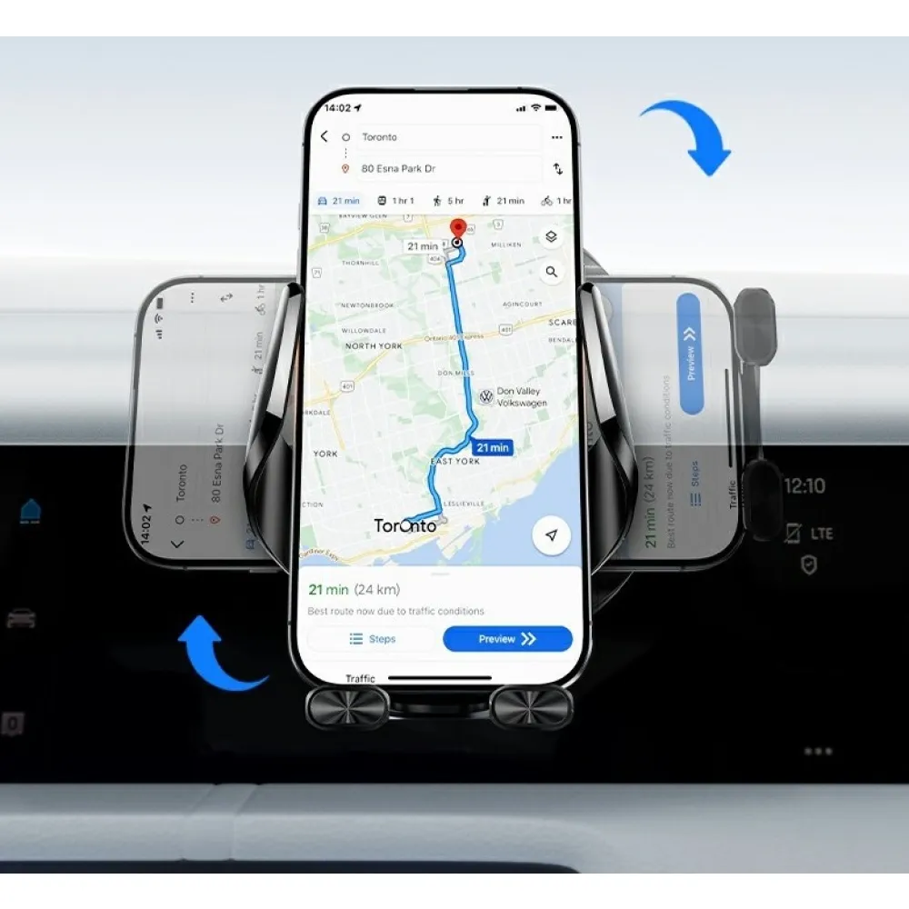 Držiak ponúka 360° otočný kĺb, ktorý umožňuje nastavenie ideálneho uhla na sledovanie displeja. Konštrukcia z kombinácie ABS plastu a skla zaisťuje pevnosť, stabilitu a moderný vzhľad. Vďaka univerzálnemu prevedeniu je vhodný pre väčšinu smartfónov podporujúcich bezdrôtové nabíjanie.