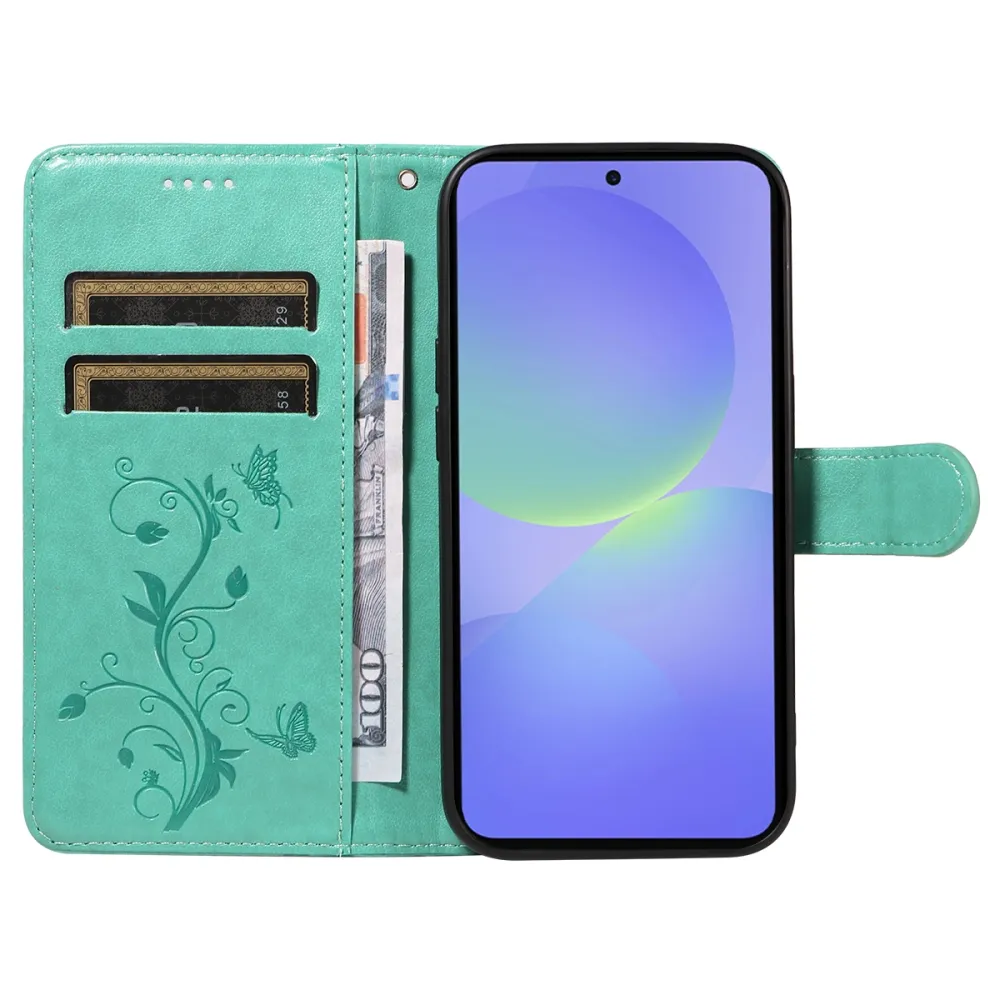 Modrozelené peňaženkové puzdro Flowers na mobil Samsung Galaxy A37 5G