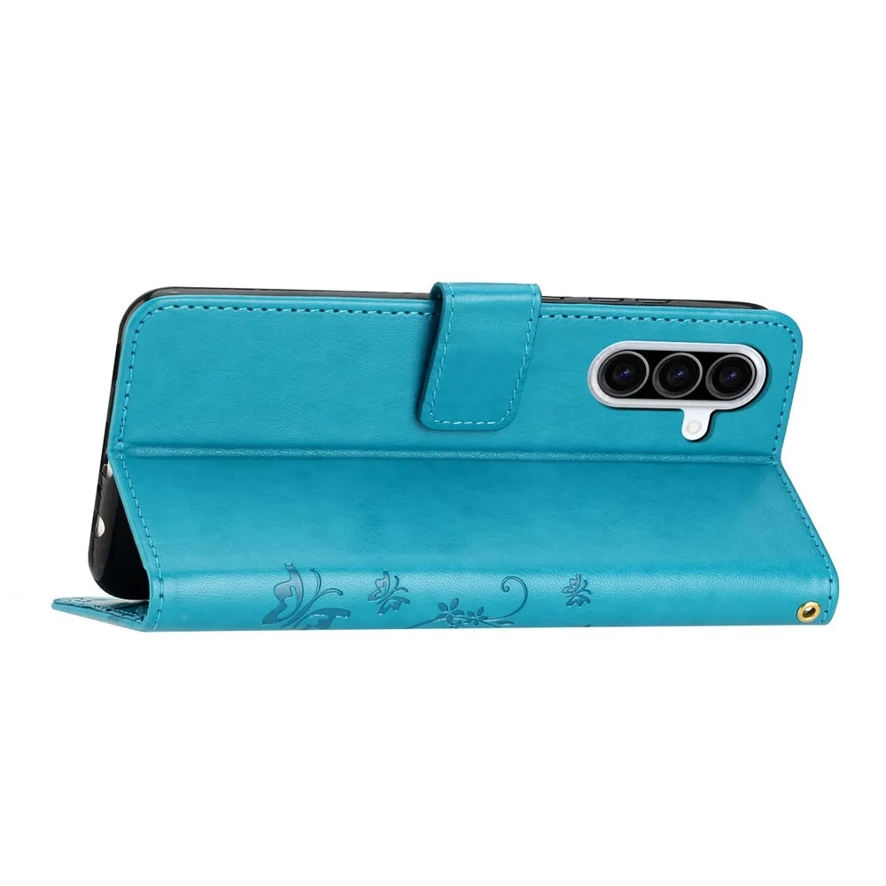 Modré peňaženkové puzdro Flowers na mobil Samsung Galaxy A57 5G