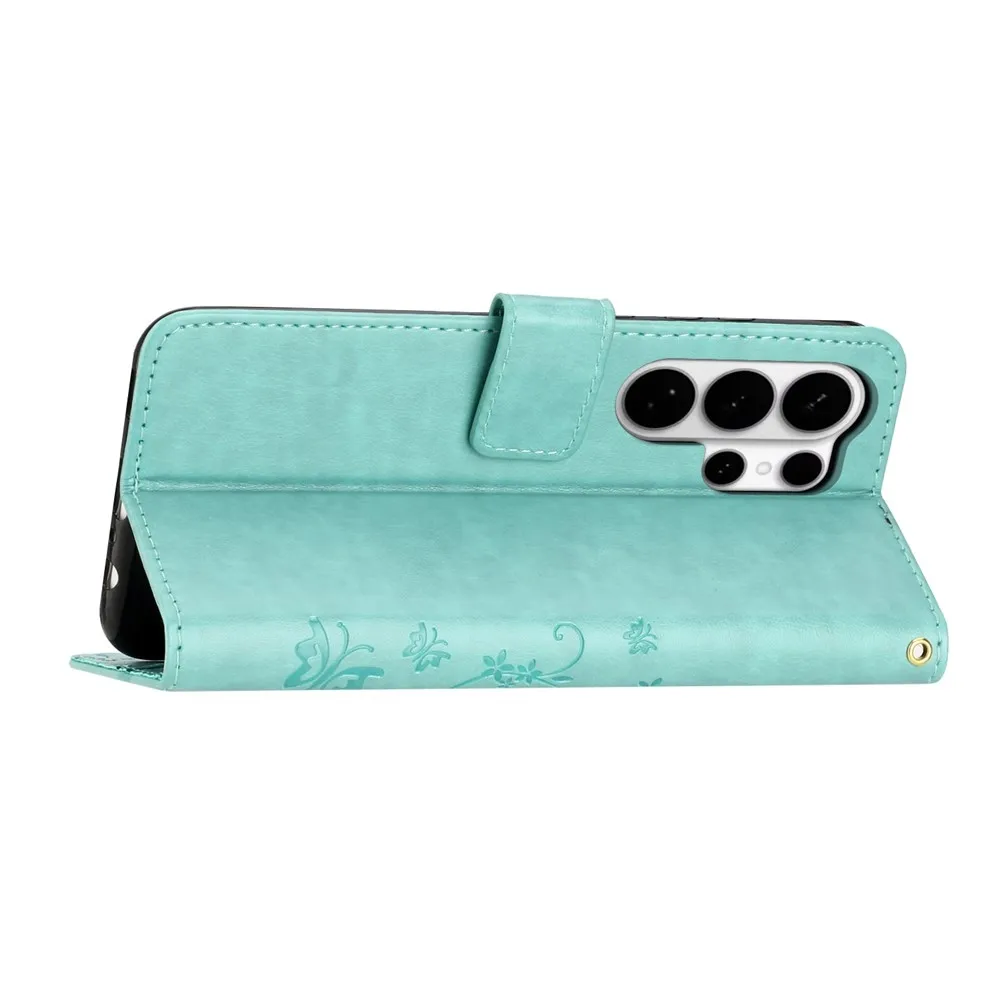 Modrozelené peňaženkové puzdro Flowers na Samsung Galaxy S26 Ultra
