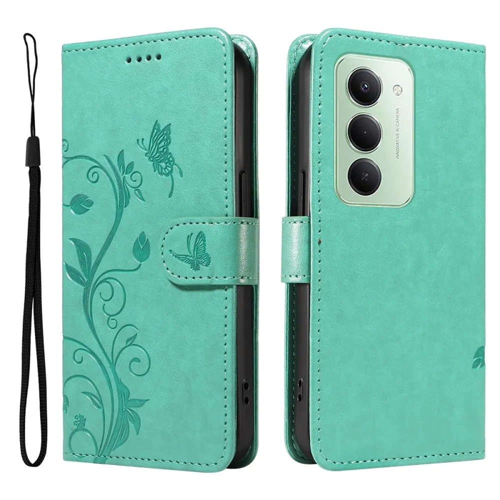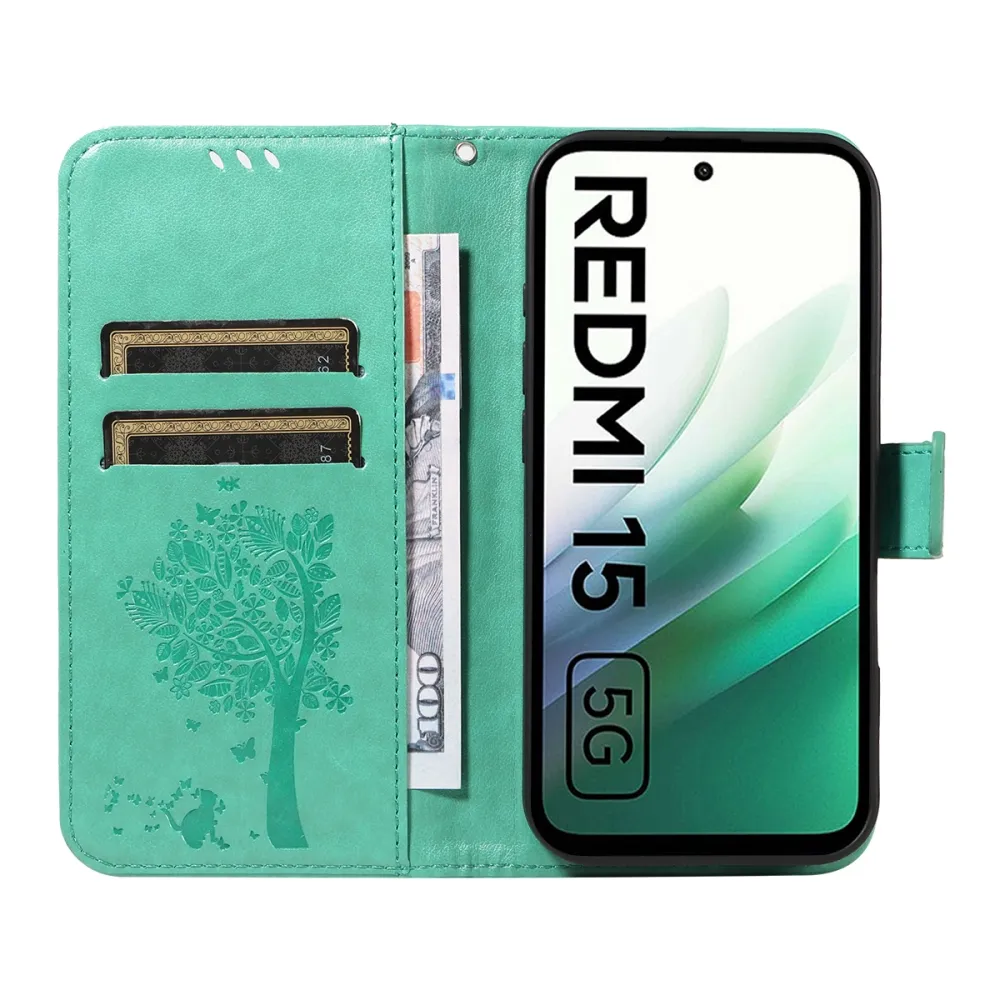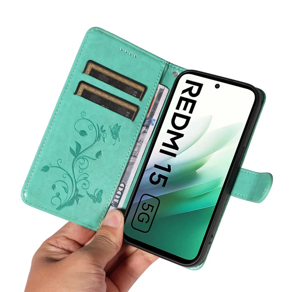 Modrozelené peňaženkové puzdro Flowery na mobil Xiaomi Redmi 15 4G (171mm)