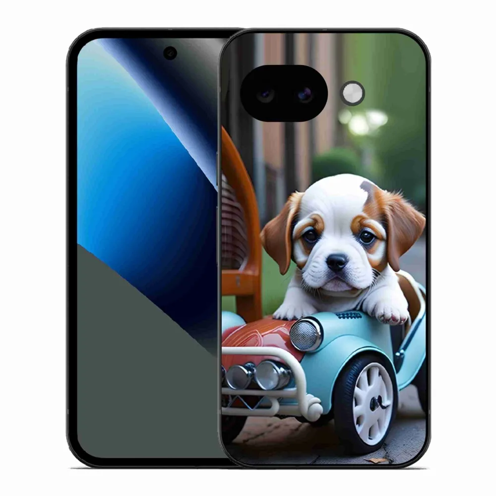 Psie púzdro na Google Pixel 10a - šteňa v retro aute poskytuje všetky výhody gélových obalov, a to v zaujímavom dizajne.