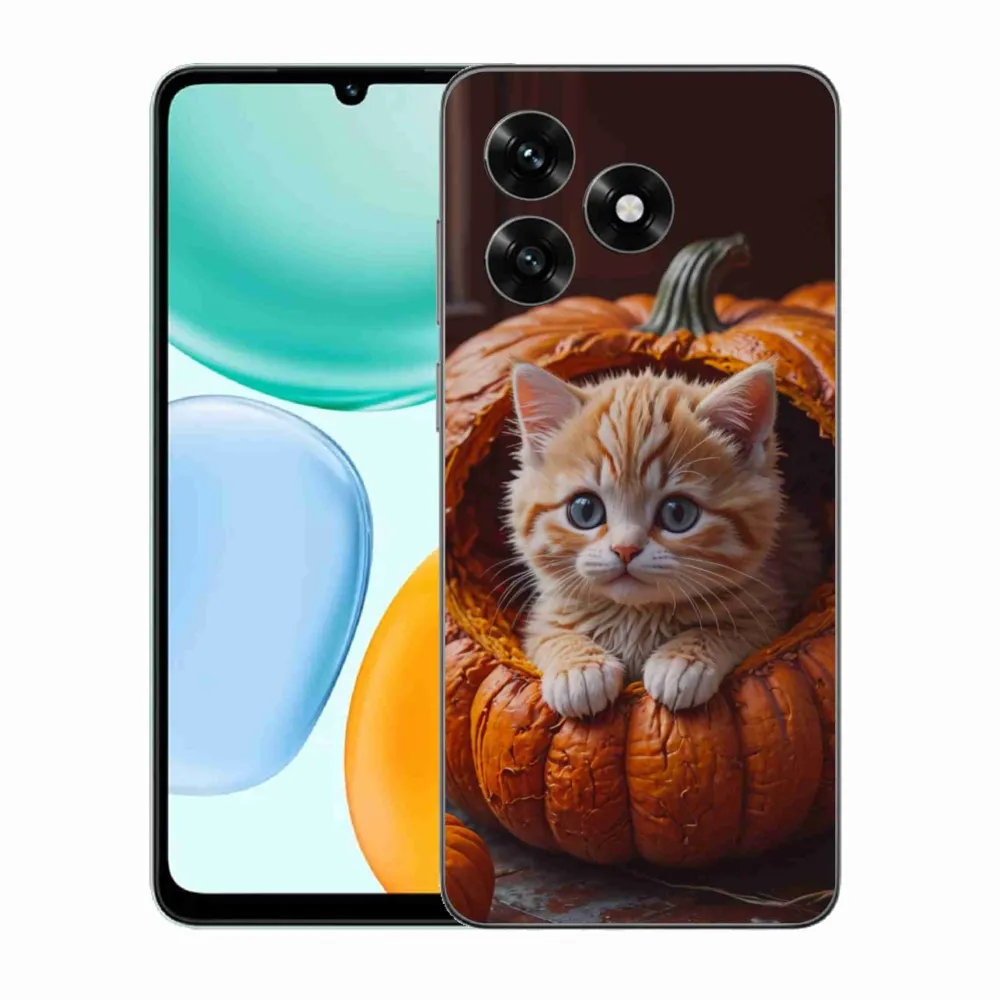 Mačacie púzdro na Honor X5c Plus - mačiatko a tekvica 2 poskytuje všetky výhody gélových obalov, a to v zaujímavom dizajne.