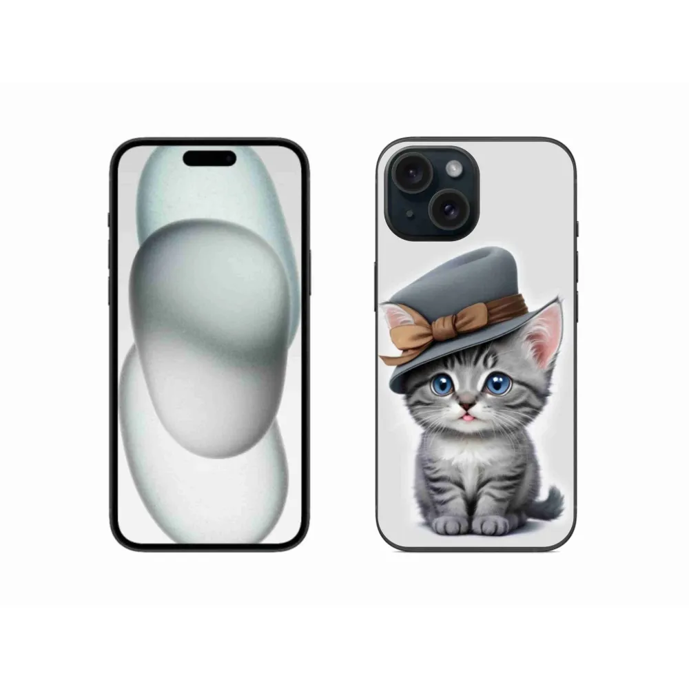 Mačacie púzdro na iPhone 15 - mačiatko s klobúkom poskytuje všetky výhody gélových obalov, a to v zaujímavom dizajne.