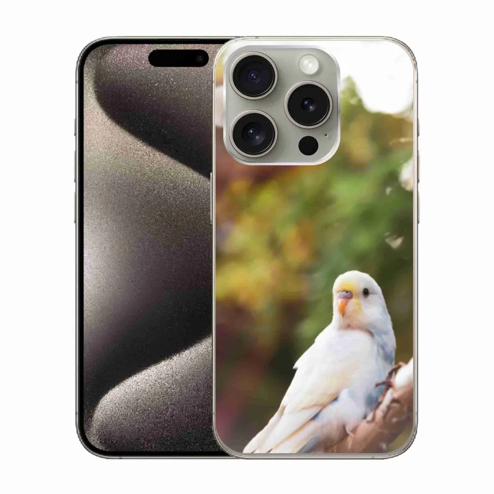 Vtáčie puzdro na iPhone 15 Pro - andulka bíela poskytuje všetky výhody gélových krytov, a to v zaujímavom dizajne.