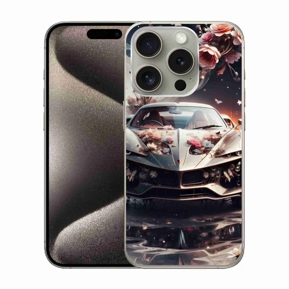 Puzdro na iPhone 15 Pro - kvetinový športový automobil poskytuje všetky výhody gélových obalov, a to v zaujímavom dizajne.