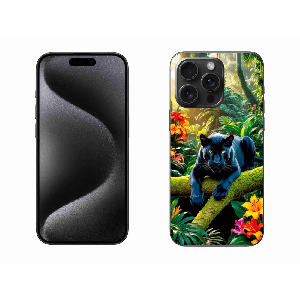 Zvieracie puzdro na iPhone 15 Pro Max - čierny panter v džungli poskytuje všetky výhody gélových obalov, a to v zaujímavom dizajne.