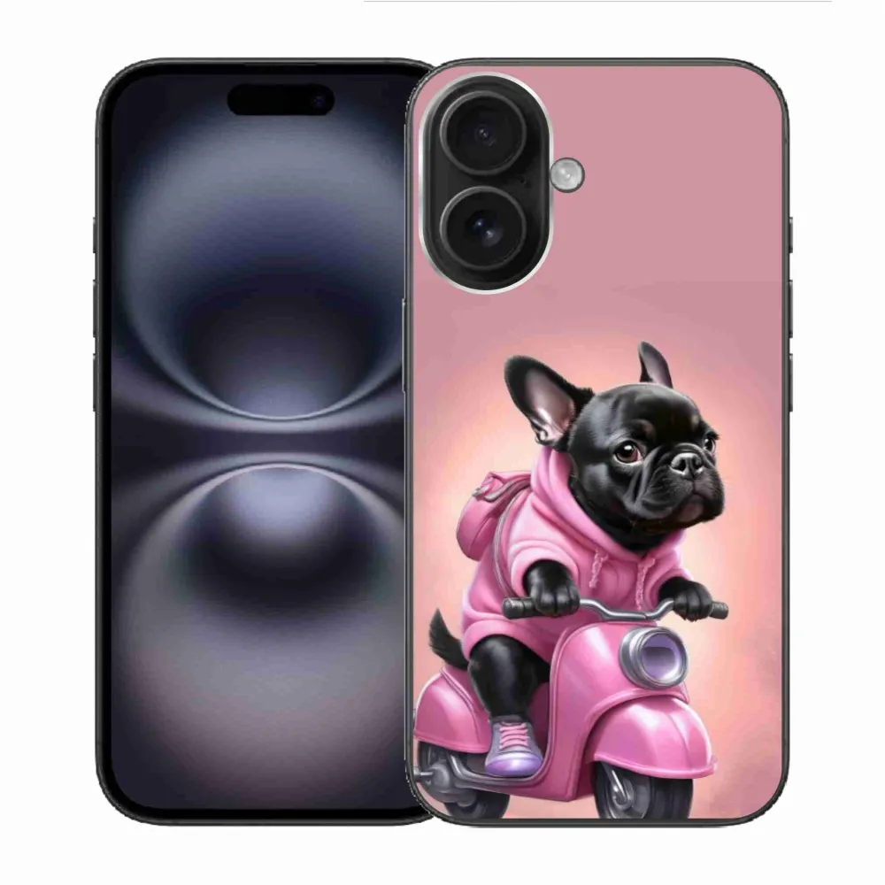 Gélový kryt mmCase na iPhone 16 - francúzsky buldoček na skútri