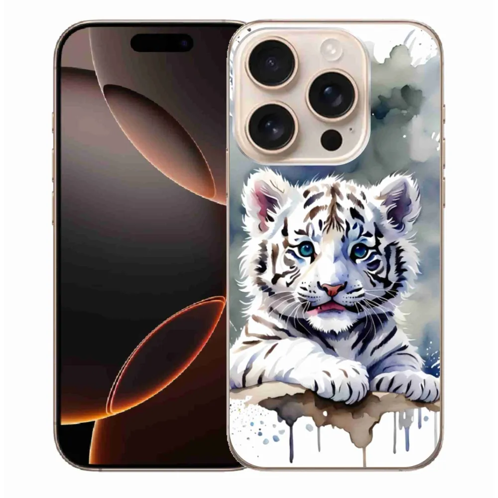 Psie púzdro na iPhone 16 Pro Max - mláďa bieleho tigra poskytuje všetky výhody gélových obalov, a to v zaujímavom dizajne.
