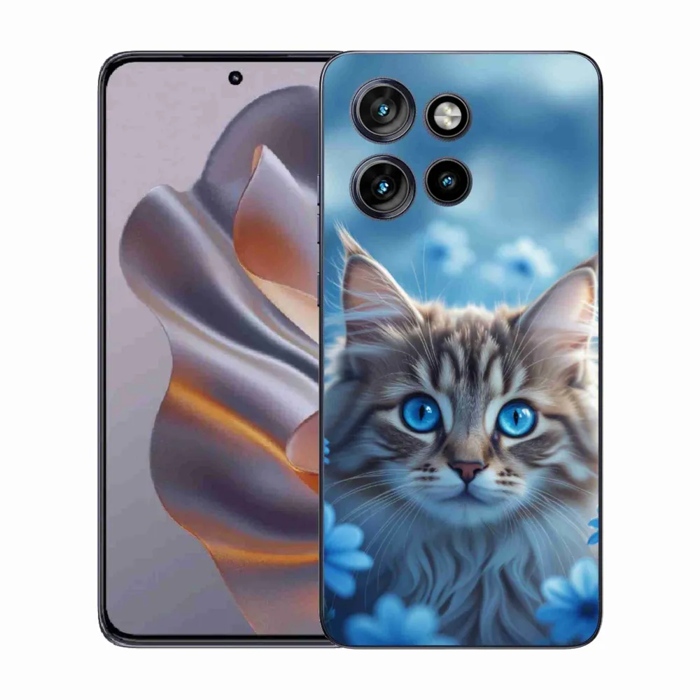 Mačacie púzdro na Motorola Edge 50 Neo - mačiatko v modrých kvetoch poskytuje všetky výhody gélových obalov, a to v zaujímavom dizajne.