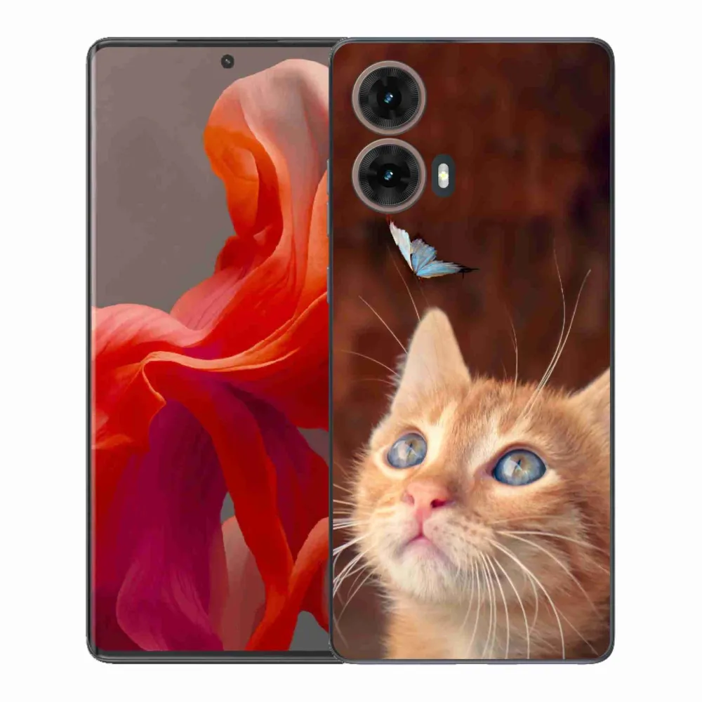 Motýlie puzdro na Motorola Moto G85 5G - motýľ a mačiatko poskytuje všetky výhody gélových krytov, a to v zaujímavom dizajne.