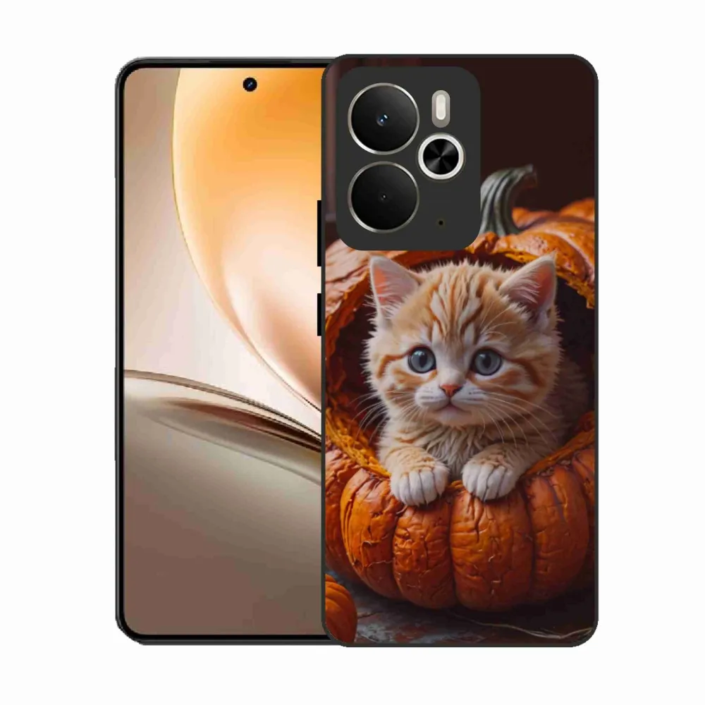 Mačacie púzdro na Realme 14T 5G/14 5G - mačiatko a tekvica 2 poskytuje všetky výhody gélových obalov, a to v zaujímavom dizajne.