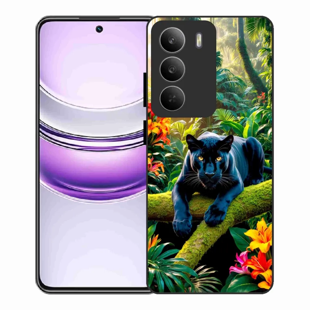 Zvieracie puzdro na Realme 14x 5G - čierny panter v džungli poskytuje všetky výhody gélových obalov, a to v zaujímavom dizajne.