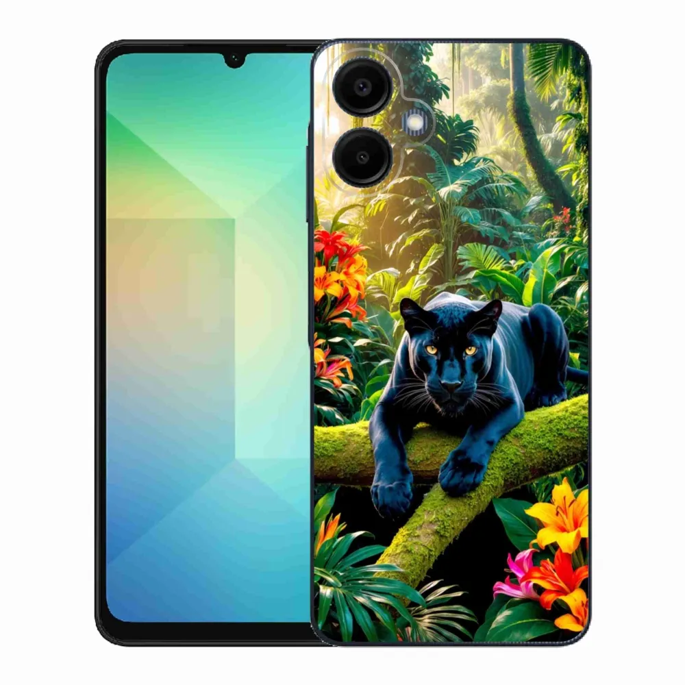 Zvieracie puzdro na Samsung Galaxy A06 - čierny panter v džungli poskytuje všetky výhody gélových obalov, a to v zaujímavom dizajne.