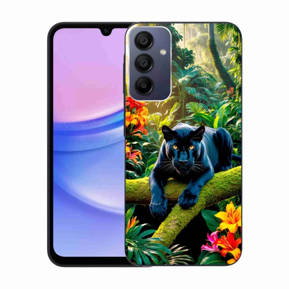 Zvieracie puzdro na Samsung Galaxy A15/5G - čierny panter v džungli poskytuje všetky výhody gélových obalov, a to v zaujímavom dizajne.