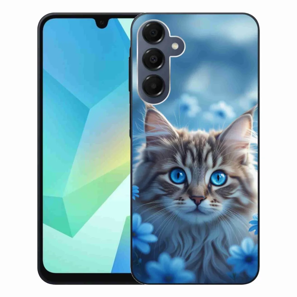 Mačacie púzdro na Samsung Galaxy A16 4G/5G - mačiatko v modrých kvetoch poskytuje všetky výhody gélových obalov, a to v zaujímavom dizajne.
