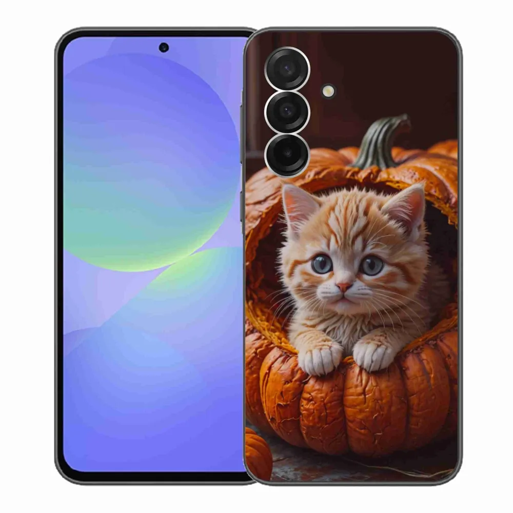Pružný gélový obal mmCase s obrázkom na Samsung Galaxy A36 5G - mačiatko a tekvica 2