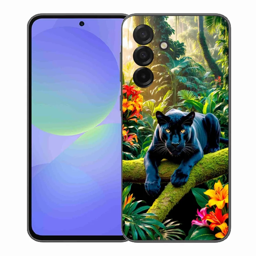 Zvieracie puzdro na Samsung Galaxy A37 5G - čierny panter v džungli poskytuje všetky výhody gélových obalov, a to v zaujímavom dizajne.