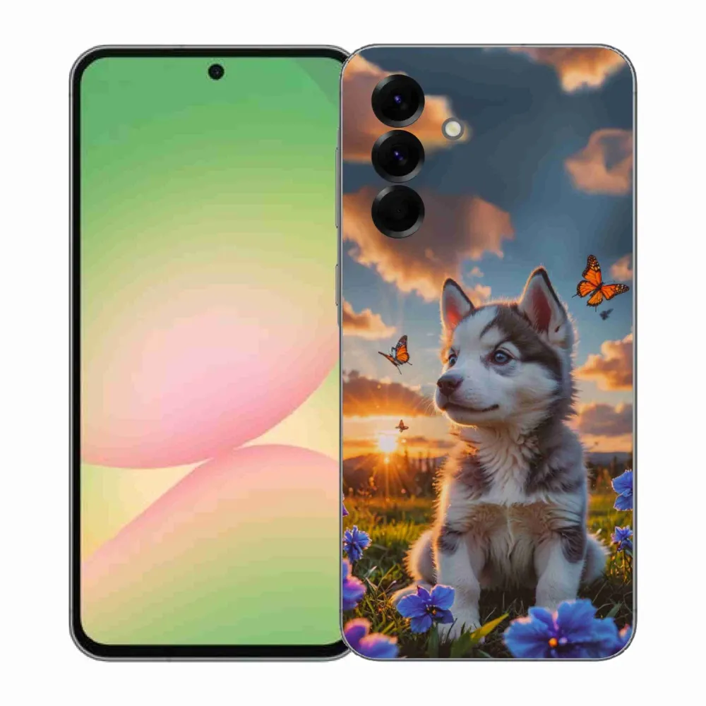 Psie púzdro na Samsung Galaxy A57 5G - husky pri západe slnka poskytuje všetky výhody gélových obalov, a to v zaujímavom dizajne.