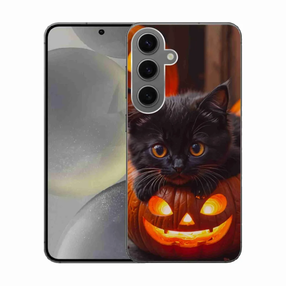 Mačacie púzdro na Samsung Galaxy S24 - mačiatko a tekvica poskytuje všetky výhody gélových obalov, a to v zaujímavom dizajne.