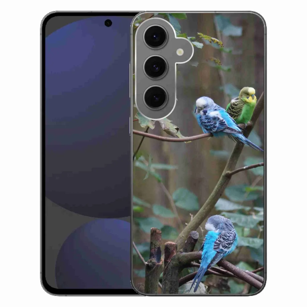 Vtáčie puzdro na Samsung Galaxy S24 FE - papagáje na vetve poskytuje všetky výhody gélových krytov, a to v zaujímavom dizajne.