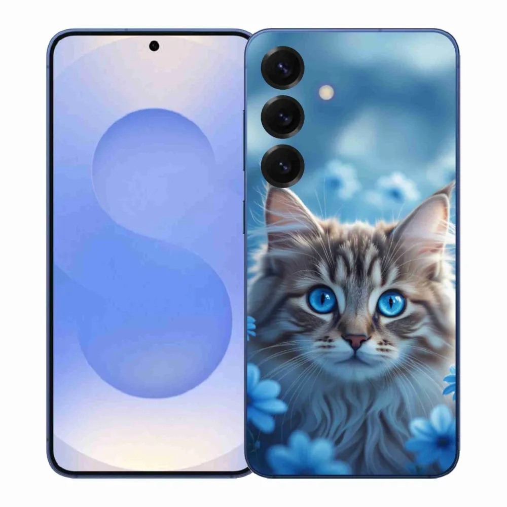 Mačacie púzdro na Samsung Galaxy S26+ - mačiatko v modrých kvetoch poskytuje všetky výhody gélových obalov, a to v zaujímavom dizajne.