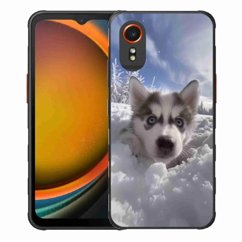 Psie púzdro na Samsung Galaxy Xcover 7 - husky v snehu poskytuje všetky výhody gélových obalov, a to v zaujímavom dizajne.