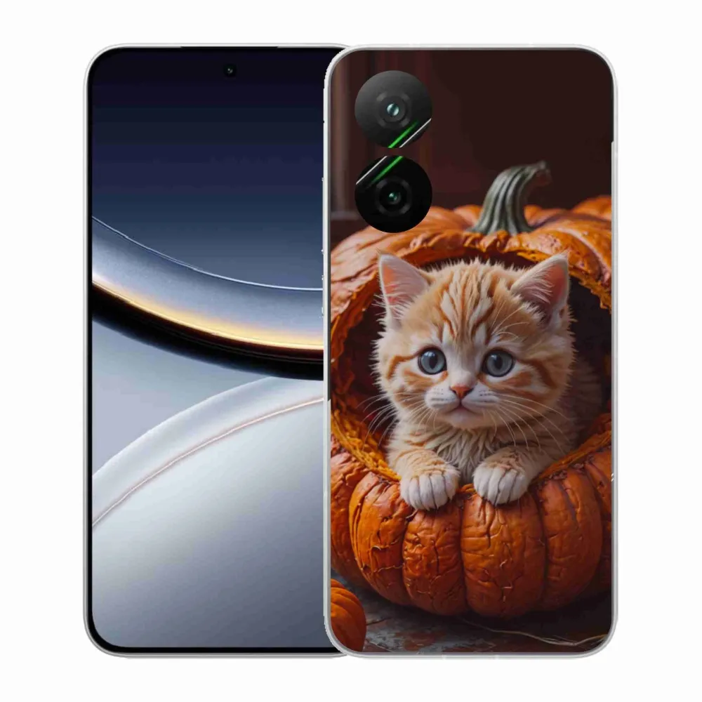 Pružný gélový obal mmCase s obrázkom na Xiaomi Poco F7 5G - mačiatko a tekvica 2