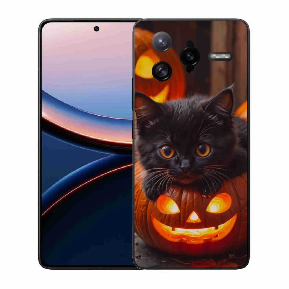 Mačacie púzdro na Xiaomi Poco F7 Ultra - mačiatko a tekvica poskytuje všetky výhody gélových obalov, a to v zaujímavom dizajne.