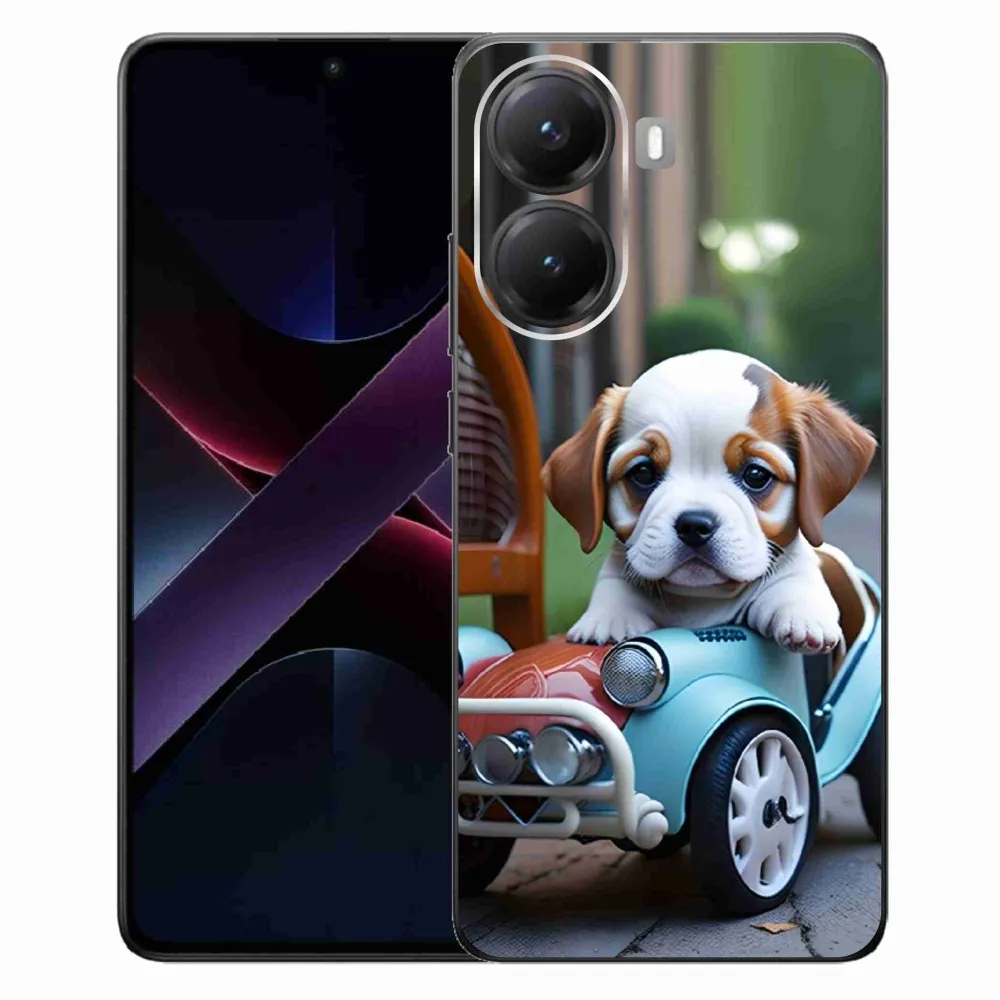 Psie púzdro na Xiaomi Poco X7 Pro 5G - šteňa v retro aute poskytuje všetky výhody gélových obalov, a to v zaujímavom dizajne.