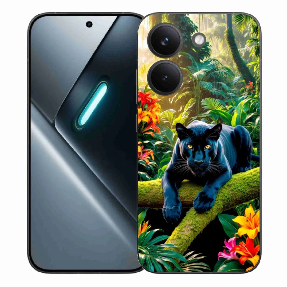 Zvieracie puzdro na Xaiomi Poco X8 Pro - čierny panter v džungli poskytuje všetky výhody gélových obalov, a to v zaujímavom dizajne.
