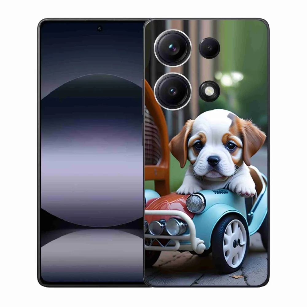 Psie púzdro na Xiaomi Redmi Note 14S - šteňa v retro aute poskytuje všetky výhody gélových obalov, a to v zaujímavom dizajne.
