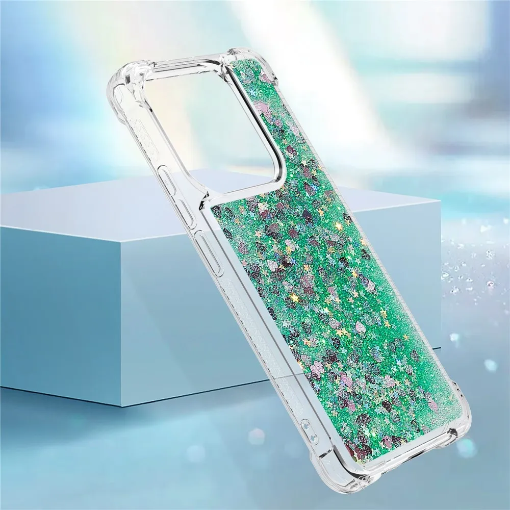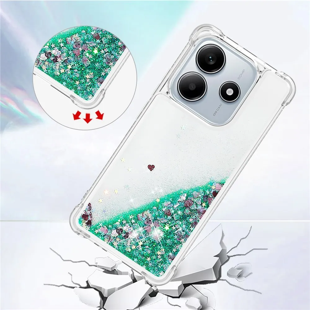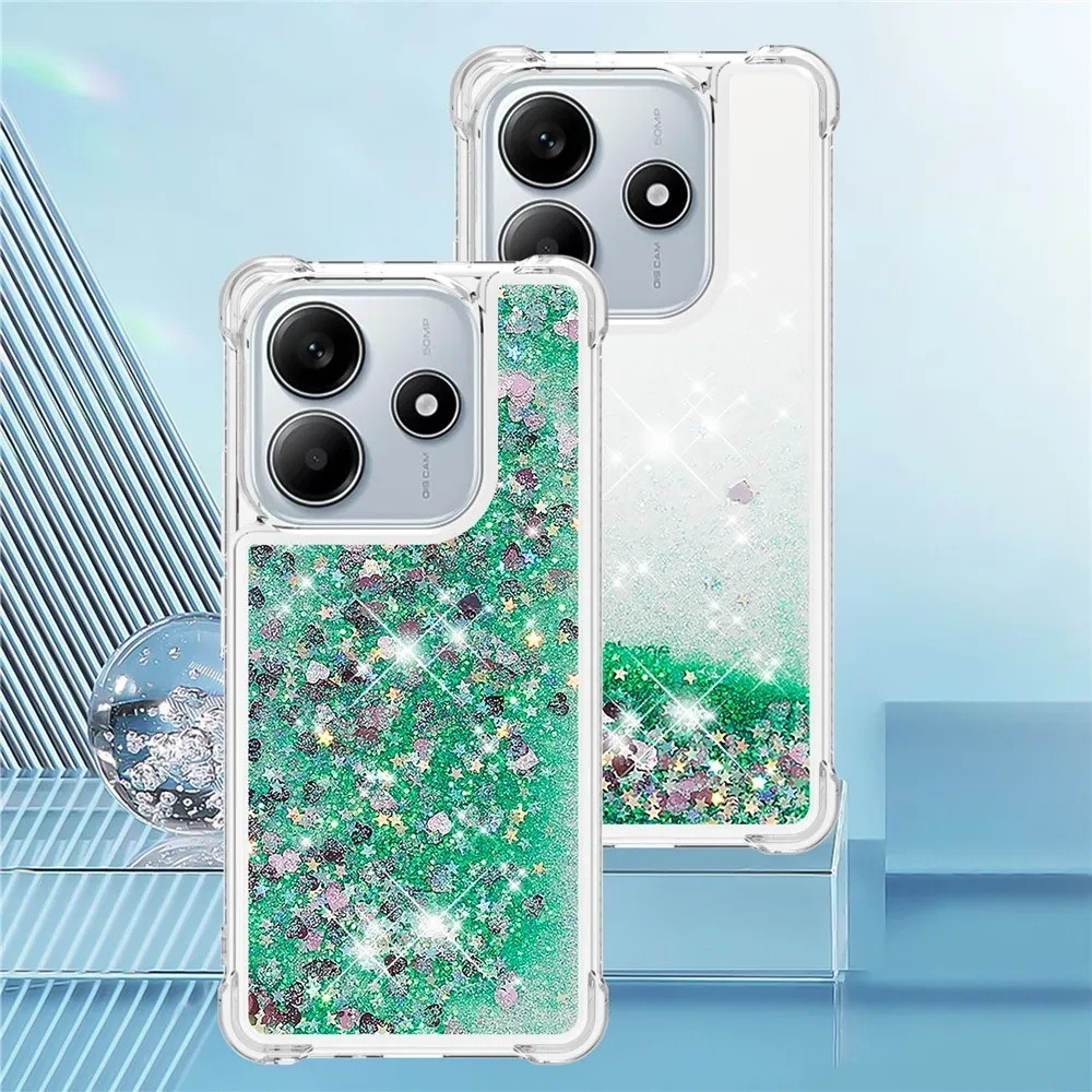 Glitter presýpací gélový obal na Xiaomi Redmi Note 14 5G - zelený/srdiečka