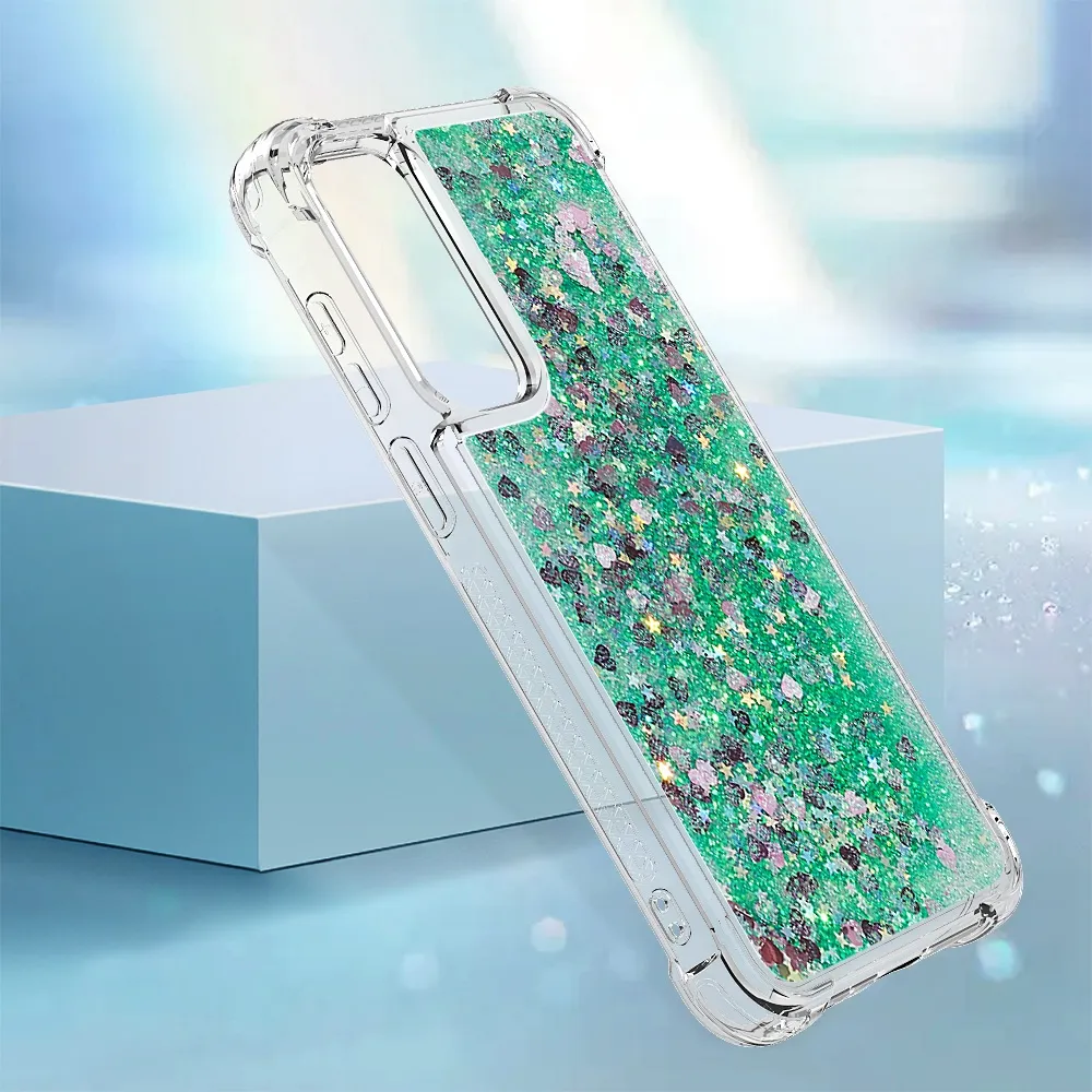 Glitter presýpacie gélový obal na Samsung Galaxy A57 5G - zelený/srdiečka